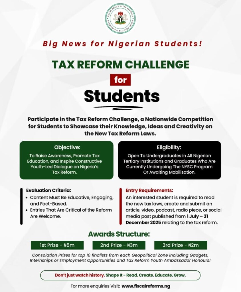 The Federal Government has introduced a nationwide N10 million grand challenge titled the “Tax Reform Challenge” for graduates and undergraduates across Nigeria.