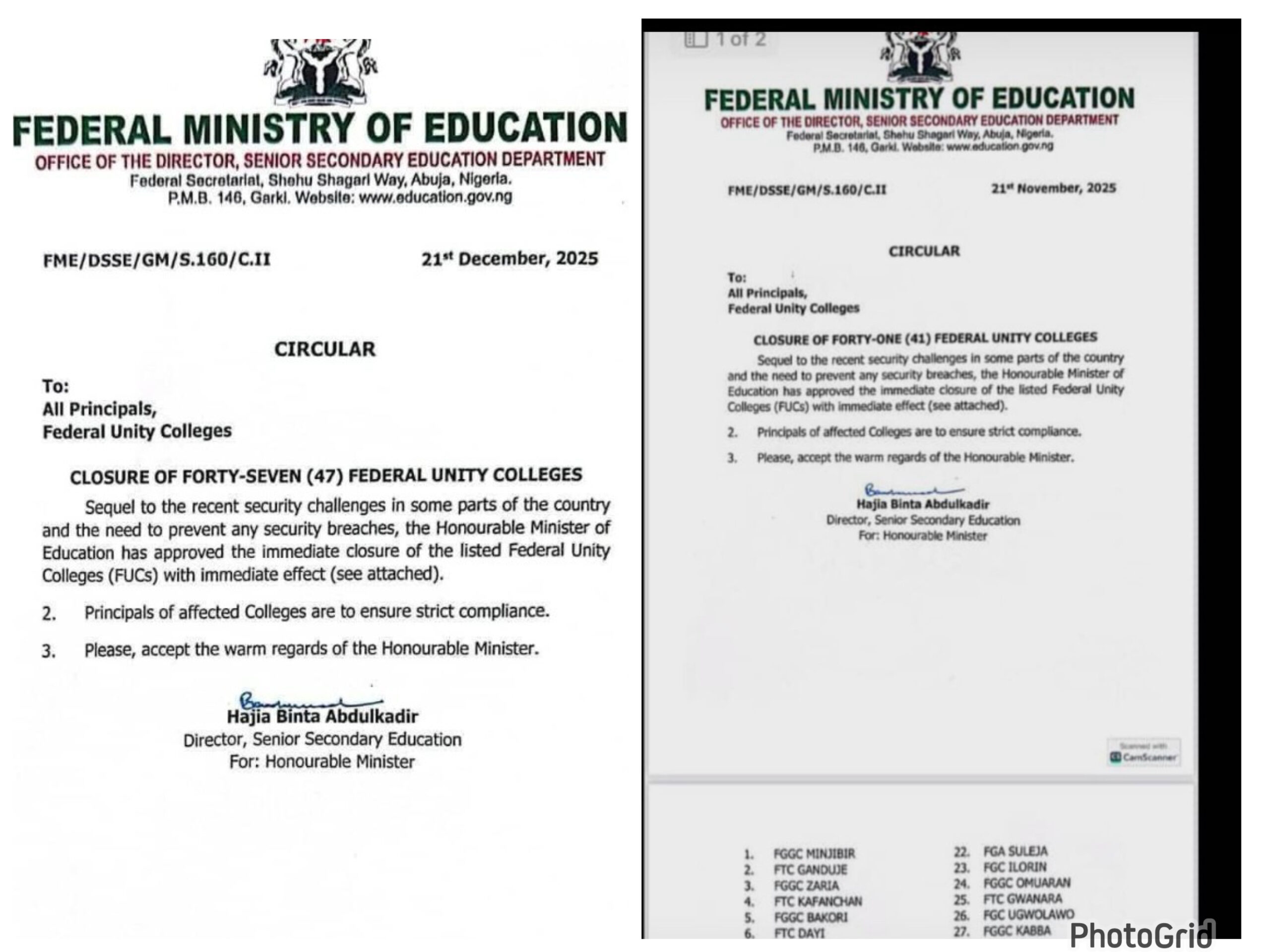 In the late hours of Friday, 21 November 2025, an alleged circular purportedly from the Federal Ministry of Education directed all Federal Unity Colleges in the country to close down. However, the said circular was dated 21 December 2025 — a date in the future — instead of the present date.