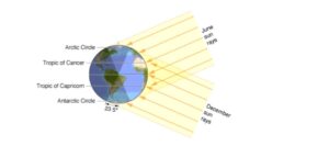 This diagram shows how Earth’s 23.5° tilt causes the Sun’s rays to strike the tropics more directly than higher latitudes. Between the Tropic of Cancer and the Tropic of Capricorn, sunlight arrives at a steeper angle sometimes directly overhead concentrating more energy at the surface. This geometry helps explain why tropical regions, including much of Africa, absorb more solar heat and are especially sensitive to global warming.